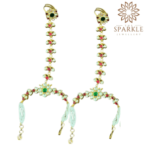 HP03-Ruby Pink & Emerald Green Teardrop Pachi Kundan Jadau Hathphool with Pearl Chain Hand Harness – 22K Gold Plated Royal Hand Jewellery | The Sparkle Jewellery