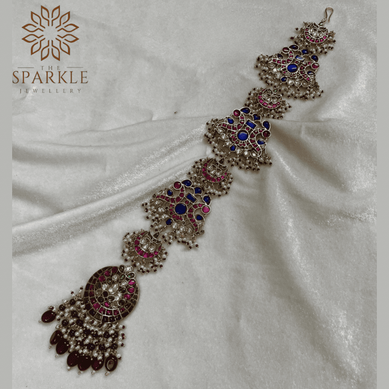 Elevate your festive and ceremonial hairstyle with this Ruby Pink & Royal Blue Jadau Pachi Kundan Hair Braid from The Sparkle Jewellery. Crafted on premium alloy base and finished with luxurious 18K gold plating, this heritage-inspired hair accessory features hand-set kundan stones and pearl detailing for an elegant traditional look. Available worldwide exclusively on The Sparkle Jewellery website with international shipping.