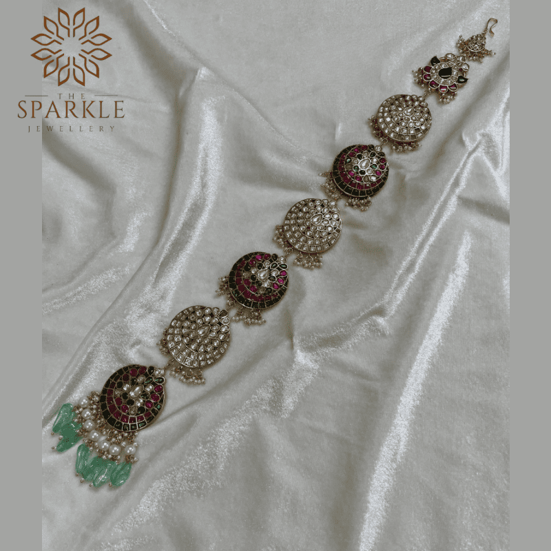 Make a royal statement with this Ruby Pink, White & Emerald Green Jadau Pachi Kundan Hair Braid from The Sparkle Jewellery. Featuring intricate kundan craftsmanship on a premium alloy base with elegant pearl and emerald green bead drops, this 18K gold plated hair accessory brings heritage beauty to traditional hairstyles. Available worldwide exclusively on the The Sparkle Jewellery official website with international shipping.