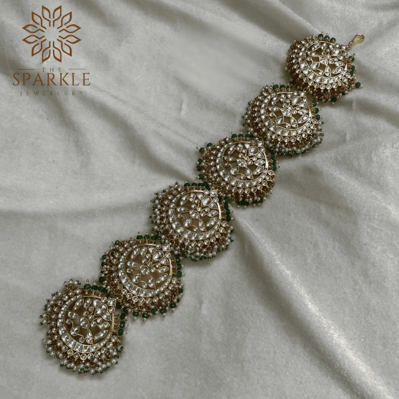 Upgrade your traditional hairstyle with this Emerald Green Jadau Pachi Kundan Hair Braid from The Sparkle Jewellery. Featuring intricate kundan craftsmanship with emerald green bead accents on a premium alloy base and finished with luxurious 18K gold plating, this heritage hair accessory delivers timeless elegance. Available worldwide exclusively on the The Sparkle Jewellery official website with international shipping.