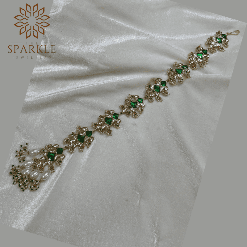 HB59-Emerald Green & Ivory White Pearl Drop Jadau Pachi Kundan Hair Braid | 18K Gold Plated South Indian & Punjabi Hair Accessory – The Sparkle Jewellery