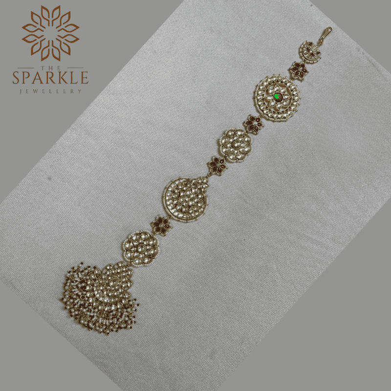 HB66-Gold Plated White Kundan Jadau Pachi Hair Braid with Emerald Green Center Stone & Pearl Drops | South Indian & Punjabi Hair Accessory – The Sparkle Jewellery