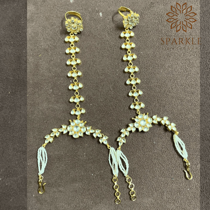 HP04-Off White & Golden Pachi Jadau Kundan Hathphool with Pearl Bracelet Chains – 22K Gold Plated Royal Hand Jewellery | The Sparkle Jewellery