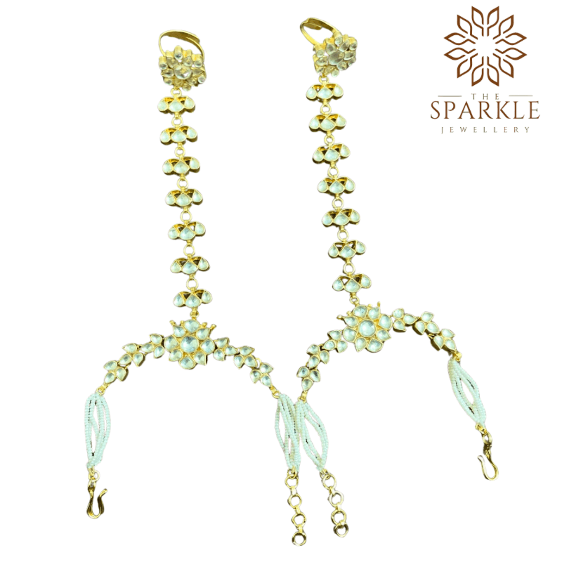 Enhance your traditional jewellery styling with this elegant Off White & Golden Pachi Jadau Kundan Hathphool by The Sparkle Jewellery. Designed with handcrafted off white pachi jadau kundan stones, rich golden heritage floral motifs, and delicate multi-strand pearl bracelet chains, this luxury hand accessory is finished with premium 22K gold plating on alloy base for long-lasting shine and durability.