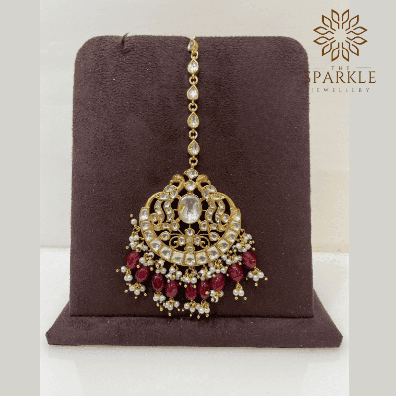 Enhance your bridal elegance with this stunning 22K Gold Plated Pachi Kundan Jadau Maang Tikka from The Sparkle Jewellery. Featuring a rich ruby enamel border, premium uncut kundan centerpiece, delicate pearl highlights, and beautiful emerald beaded drops, this luxurious design adds a regal touch to any bridal or festive look.