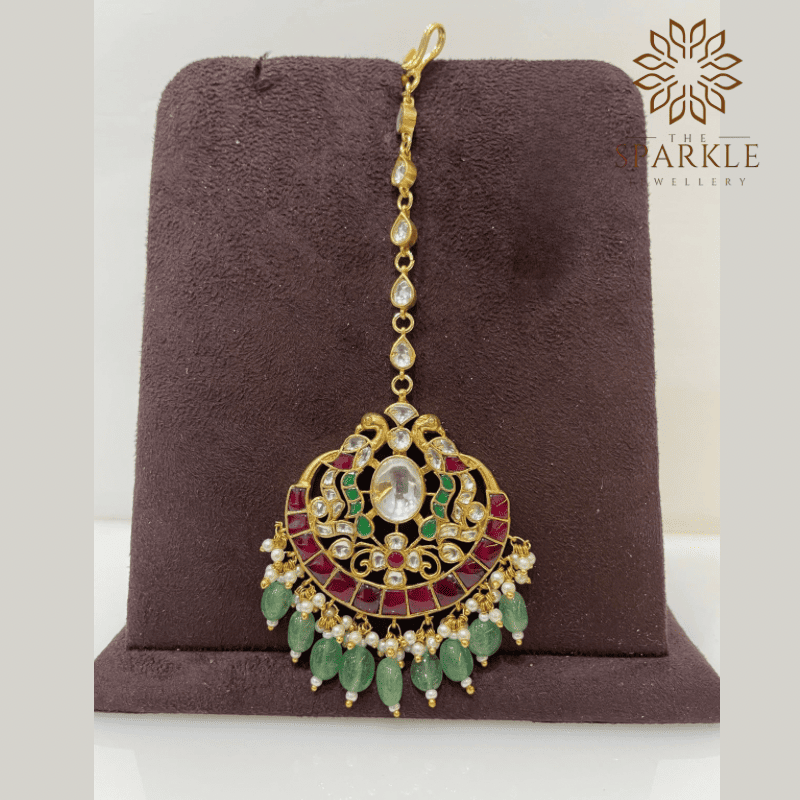 MT07-22K Gold Plated Pachi Kundan Jadau Maang Tikka – Ruby & Emerald Premium Bridal Accessory | The Sparkle Jewellery