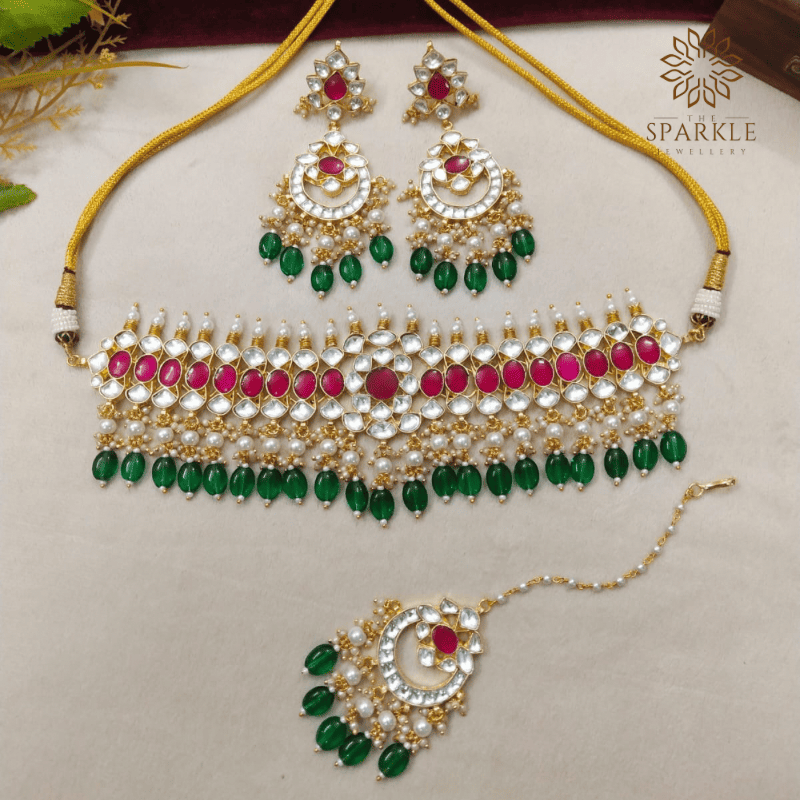 N23-Bridal Pachi Kundan Gold Plated Jewellery Set with Ruby & Emerald Drops – Choker + Earrings + Maangtikka | The Sparkle Jewellery