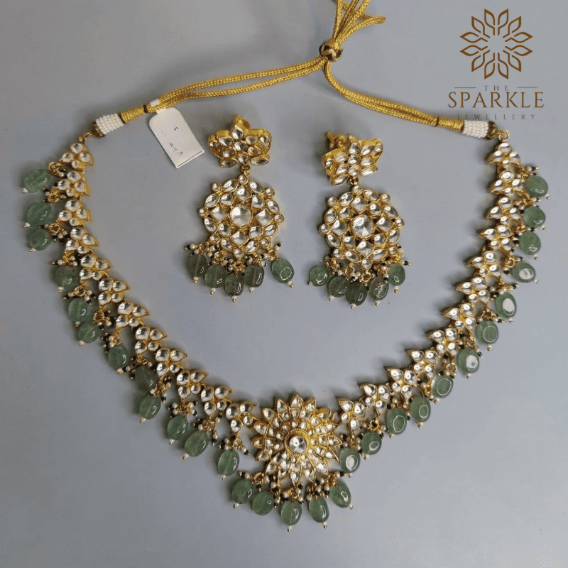N31-Mint Green Jadau Pachi Kundan 22K Gold Plated Necklace Set with Earrings – Premium Designer Jewellery