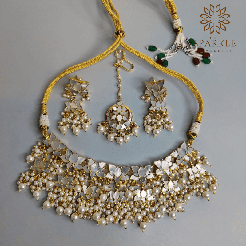 Tags: buy mother of pearl necklace online, customisable drop jewellery, designer mop necklace online, ethnic jewellery worldwide shipping, gold plated mop set with earrings and maangtikka, heritage jewellery set, indian jewellery international shipping, ivory white mop jewellery, luxury imitation jewellery, mop necklace with pearl drops, mother of pearl 22k gold plated necklace set, mother of pearl indian jewellery, premium mop jewellery, The Sparkle Jewellery