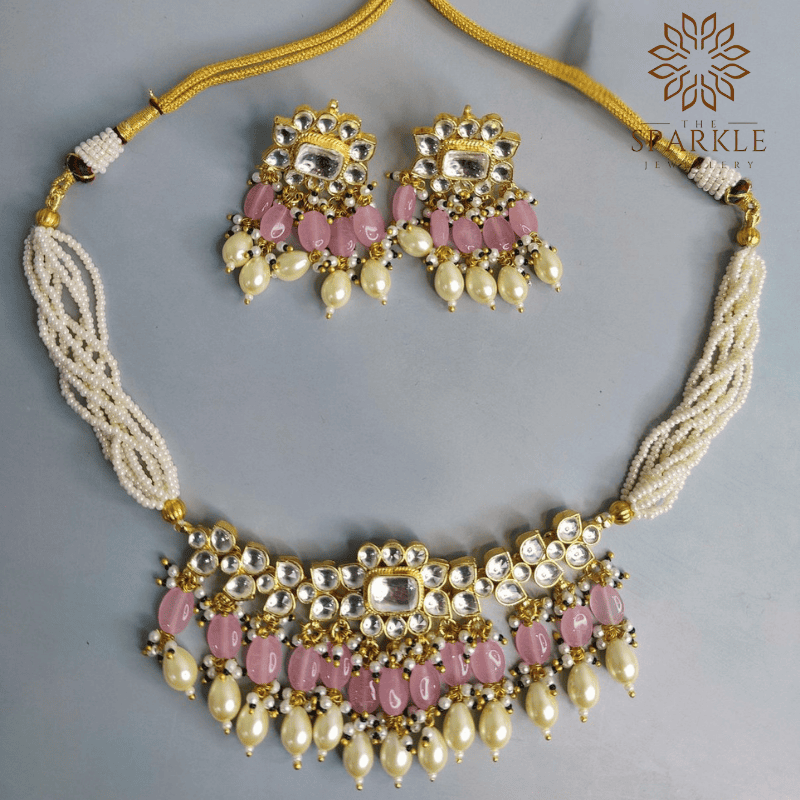 N60-Rose Pink & Ivory Pearl Jadau Kundan Gold Plated Choker Necklace Set with Earrings – Luxury Designer Jewellery