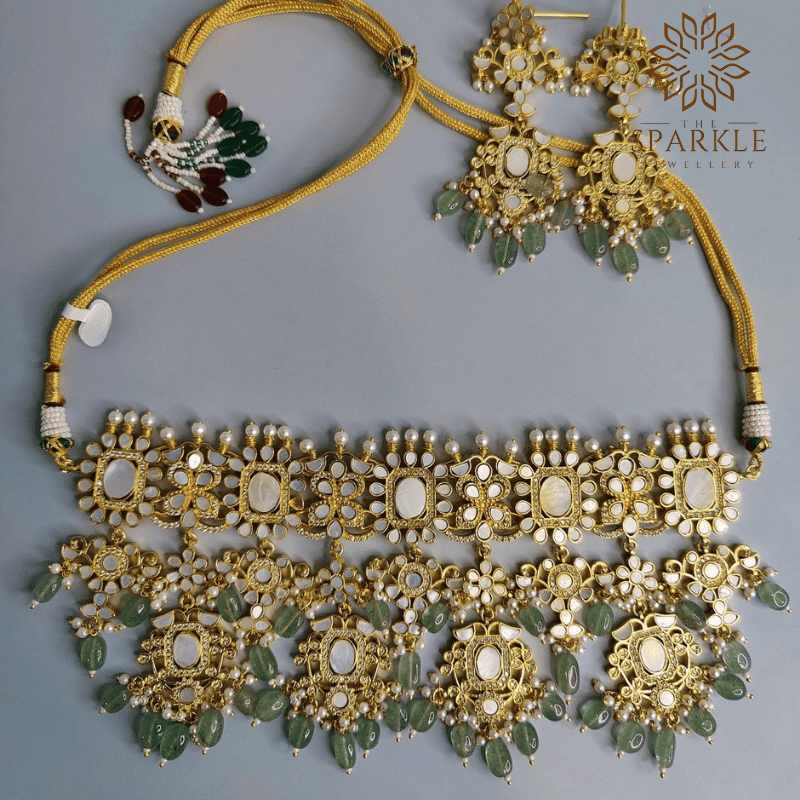 N70-Mother of Pearl Gold Plated Necklace Set with Mint Green Drops – Luxury Indian Designer Jewellery | The Sparkle Jewellery