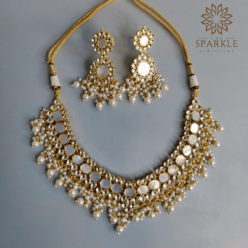 Gracefully handcrafted, this Mother of Pearl (MOP) gold plated choker necklace set features luminous shell inlay, classic kundan-style detailing, and elegant pearl white drops, paired with matching statement earrings. A refined Indian designer jewellery piece admired globally, with worldwide shipping to USA, UK, Canada & UAE.
