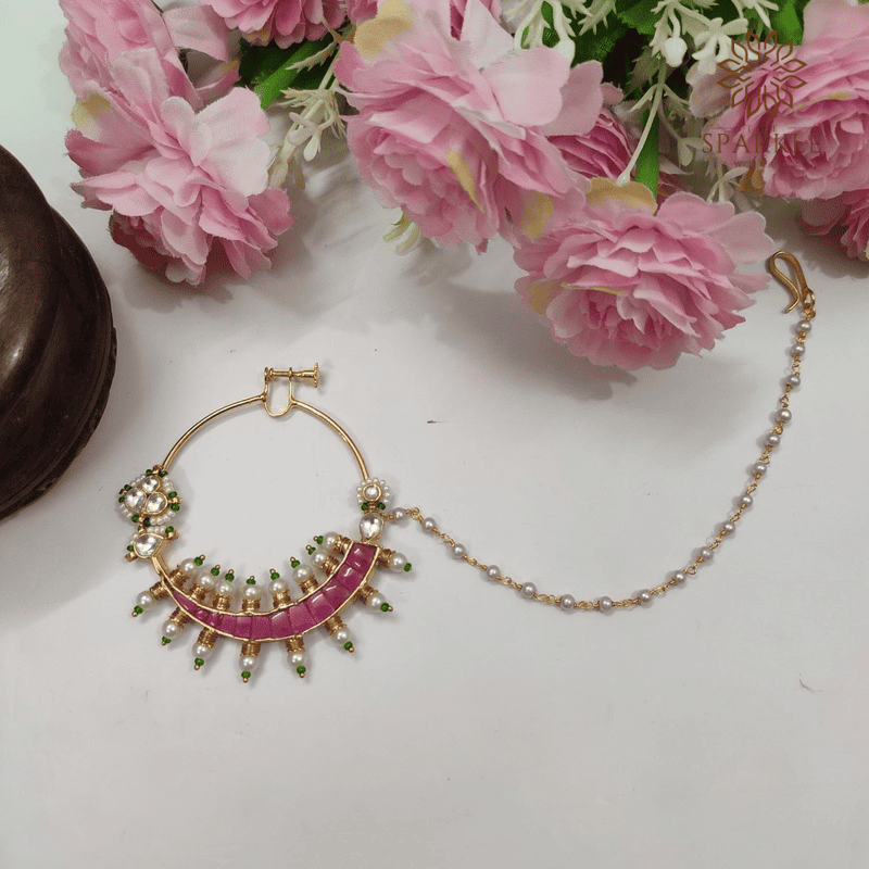 Add a hint of royal tradition to your bridal look with The Sparkle Jewellery’s Ruby Pink Pachi Kundan Nosering Nath, a handcrafted statement piece inspired by timeless Indian heritage. Designed with intricate Pachi Kundan craftsmanship, lustrous pearls, green bead accents, and premium 22K gold plating, this elegant Nath elevates every festive and bridal ensemble.
