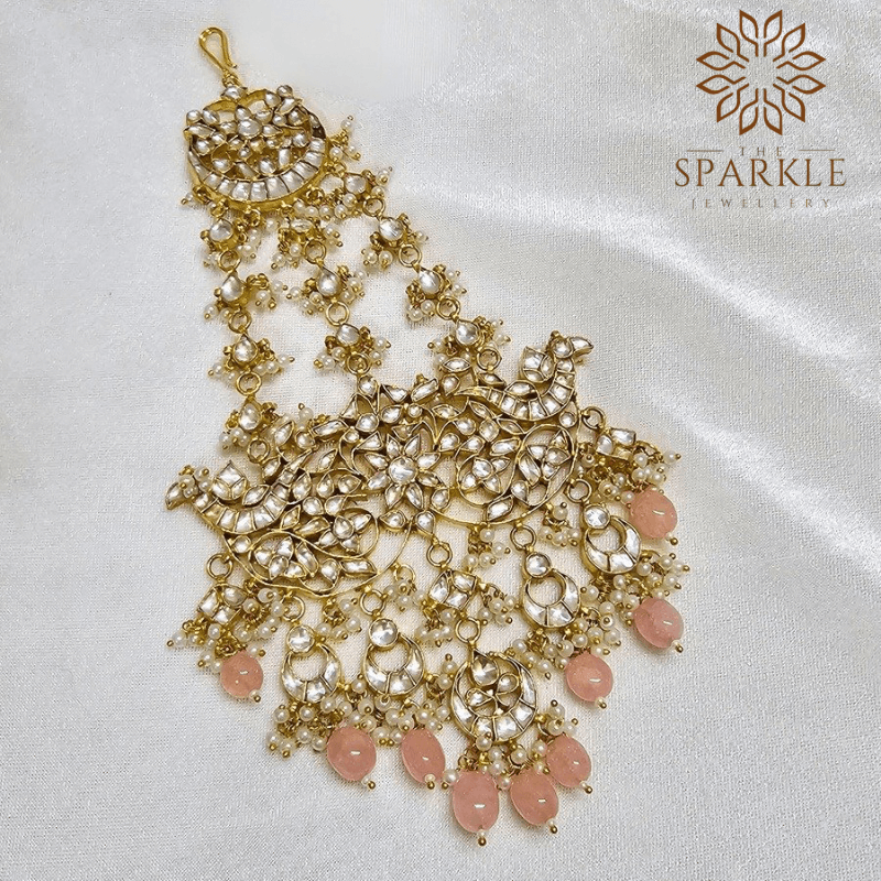 Add royal charm to your look with this Peach Drop Jadau Kundan Passa by The Sparkle Jewellery. Handcrafted with premium kundan stones set on silver foil for superior brilliance, supported by a durable copper base and finished with rich 18K gold plating. Highlighted with elegant soft peach semi-precious stone drops, this heritage-inspired hair accessory blends luxury craftsmanship with modern wearability. Available worldwide at www.thesparklejewellery.com.