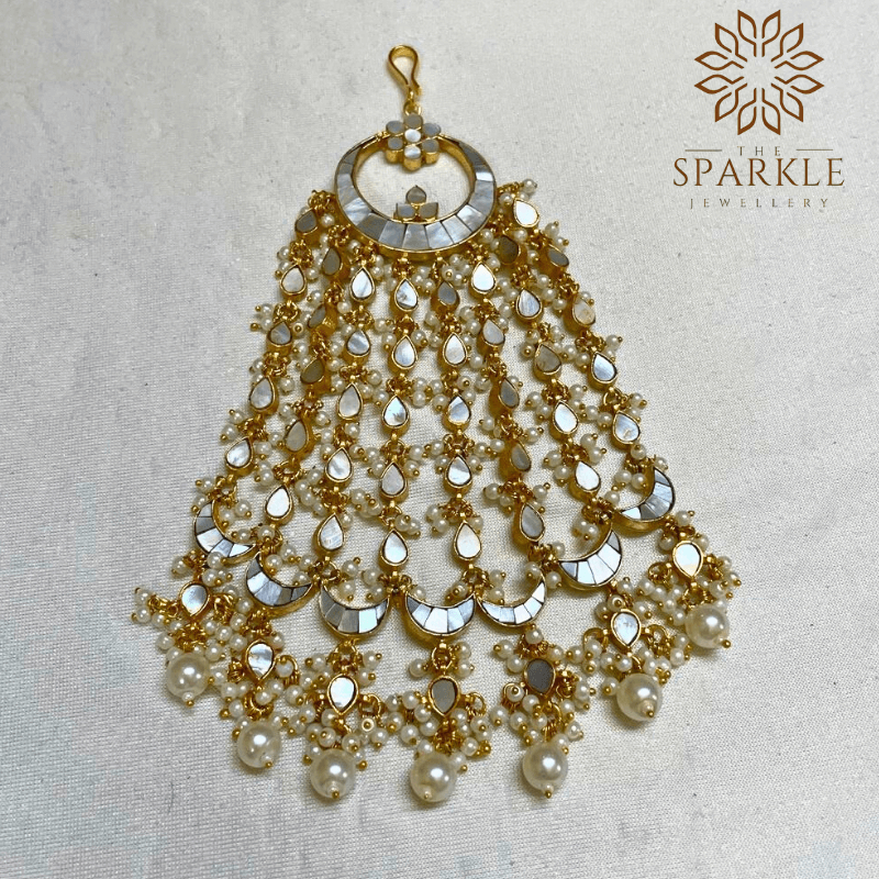 P19-Mother of Pearl Jadau Passa | 18K Gold Plated MOP Side Jhumar with Pearl Drops – The Sparkle Jewellery